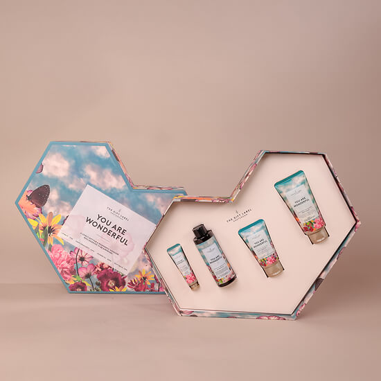 This iconic heart-shaped gift box opens to reveal a body wash, a hand et body lotion, a hand cream and a body balm. The bold graphic design with red flowers and green stripes makes it a truly eye-catching gift.