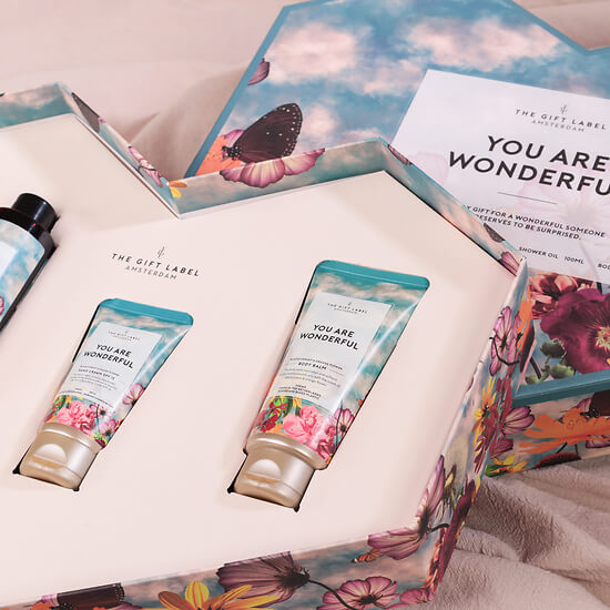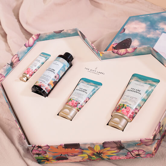 A soft and poetic gift set featuring a body wash, a hand and body lotion, a hand cream and a body balm, designed for gentle self-care moments. The colourful floral patterns and sky-blue tones create a fresh and light atmosphere.