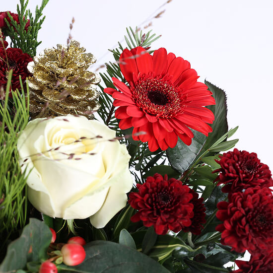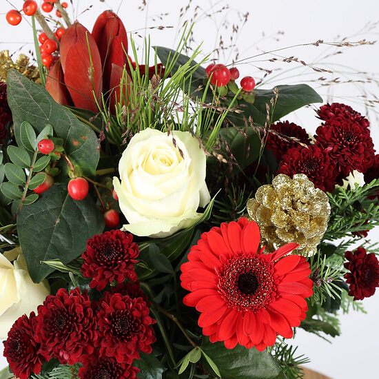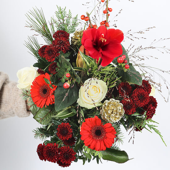Célébrez la magie des fêtes avec notre bouquet "Joyeuses Fêtes". Composé de fleurs aux couleurs vibrantes de rouge et blanc, telles que des roses, des gerberas et des chrysanthèmes, ce bouquet évoque la chaleur et la convivialité de Noël. Les touches de baies et de branches de sapin apportent une note festive, parfaite pour illuminer vos célébrations de fin d'année. Offrez ce bouquet pour répandre joie et bonheur autour de vous pendant la saison des fêtes.