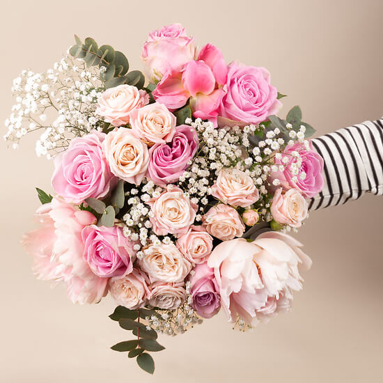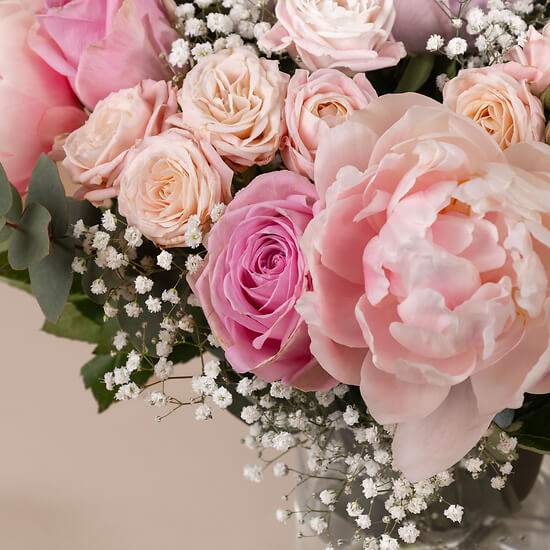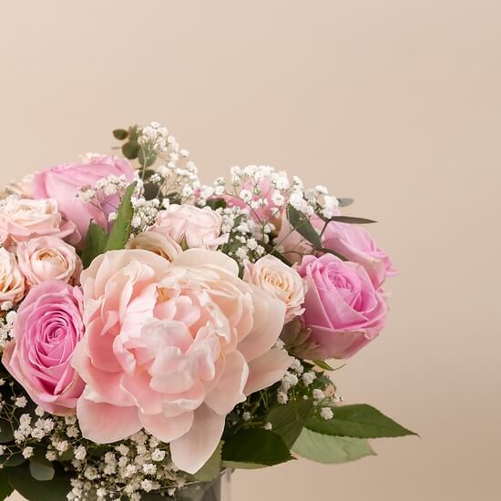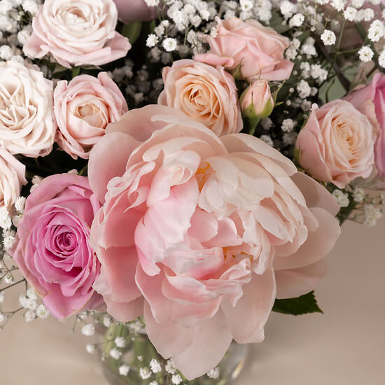 Délicat, généreux et plein de tendresse, Merci Maman est un bouquet imaginé pour célébrer toute la douceur d?une maman. Il réunit 3 pivoines rose pâle, de jolies roses dans des nuances tendres de rose poudré, ainsi qu?un léger nuage de gypsophile et quelques touches d?eucalyptus.
