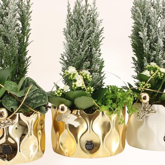 Tauchen Sie ein in die festliche Stimmung mit diesem Arrangement von ca. 40 cm Höhe, das eine verschneite Tanne und hübsche Winterpflanzen in einem prächtigen goldenen Übertopf vereint. Jedes Stück ist ein Unikat ? die Farbe des Topfes wird zufällig ausgewählt, um den Zauber von Weihnachten zu bewahren.