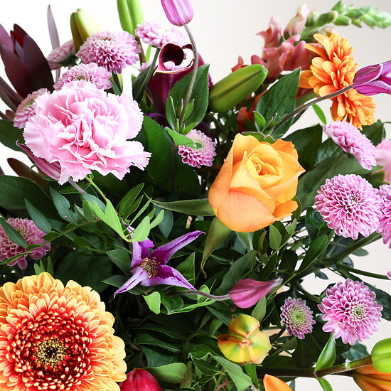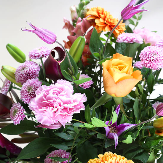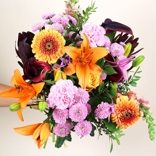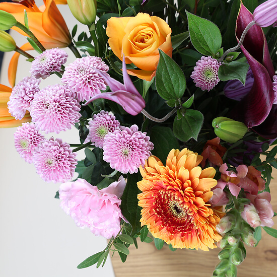 Drücken Sie Ihre aufrichtigsten Gefühle mit unserem Bouquet Zuneigung aus, eine Hommage an die warmen Emotionen des Herbstes. Dieser Strauß vereint anmutig leuchtend orangefarbene Lilien, ein Symbol der Leidenschaft, mit zarten rosa Chrysanthemen und feinen Nelken. Die violetten Akzente verleihen eine geheimnisvolle Note, während die grünen Blätter eine subtile Frische bringen. Perfekt, um Sanftheit und Fürsorge zu übermitteln, ist dieser Strauß ein ideales Geschenk, um die Herzen Ihrer Lieben zu erwärmen oder Ihrem Zuhause in der goldenen Jahreszeit eine behagliche Note zu verleihen.